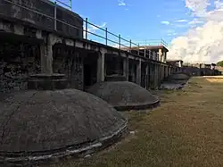 While Native Americans most likely used the island for fishing, the first permanent settlement took place in the 1830s on the island's east end at Fort Caswell.[5] Now utilized as a Christian retreat and conference center, during the Civil War the fort defended Confederate positions on the North Carolina coast and subsequently served as an army training ground in World War I and a patrol/ communications base in World War II.[6] In 2013, along with the Fort Caswell Rifle Range constructed during WWI,[7] it was designated as a National Historic District.[8]
