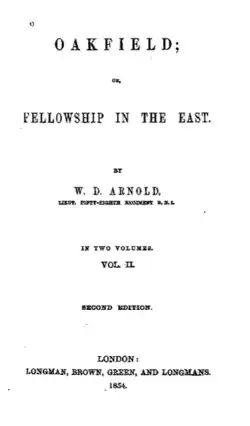 Oakfield; or, Fellowship in the East is a novel by William Delafield Arnold, first published in 1853. The book is one of the earliest novelistic accounts of life in British India, and its plot strongly mirrors the biography of its author. Set in India about the time of the First Afghan War, the novel describes the unhappy experiences of the eponymous Edward Oakfield, a graduate of Oxford who enlisted with the East India Company's military service because he tired of the metaphysical debates dominating that university. In India, Oakfield is disgusted by what he sees as an absence of Christian gentlemanliness among the Company's military officers, and he soon retreats to the comradeship of a few like-minded people.
