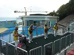 The Waterfront and Summit areas are also connected by the Ocean Express, a tunnel funicular system that opened on 9 September 2009.[31] Two trains, one going uphill and one downhill, travel simultaneously in a 1.3-kilometre (0.81 mi) tunnel through Brick Hill at a maximum speed of 7 m/s (23 ft/s).[31][60][61] Each train carries up to 250 passengers and has 40 seats. They are themed to resemble submarines, featuring dimmed lights and animations playing on ceiling panels to simulate an underwater environment.[60] The Ocean Express was included in the park's 2005 redevelopment plan to supplement the cable car system, in preparation for future increases in the park's attendance.[27][60] The system was built by Swiss company Garaventa, while the trains were made by Gangloff Switzerland.[60]