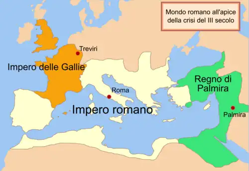 The Roman Empire at the centre, with the Gallic Empire to the west, the Kingdom of Palmyra to the east.