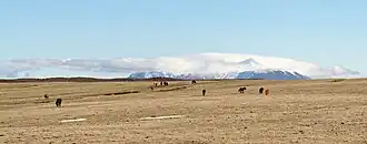 The 7800 years BP Kjalhraun flow to the north-east has a similar area but covers only 11 km3 (2.6 cu mi) with its eastern portion broken up by faulting from the Hofsjökull volcanic system.[13][14] On the Kjalhraun flow's northern edge is the Hveravellir high-temperature geothermal field with an area of 2.5 km2 (0.97 sq mi).[6]