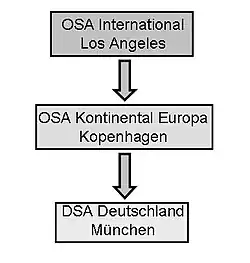 At local Scientology organizations, directors of the departments for Special Affairs, Legal, and Public Affairs are all staff members from OSA and report directly to OSA superiors instead of local church executives.[9] OSA members sent to local churches are known as Directors of Special Affairs, or DSAs. Members of the Office of Special Affairs are drawn from the Sea Org.[10]