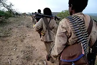 In 2001, ONLF training camps were operational in Eritrea and by 2002 training began for the first contingent of ONLF female fighters.[20] Over the early 2000's the ONLF's military capabilities expanded and the organization began stepping up attacks against Ethiopian military positions in the Ogaden, with a significant escalation in armed conflict occurring during 2005.[19] The Ethiopian government took advantage of the War on Terror to routinely label opposition movements terrorists,[21] and accused the ONLF of being associated with and linked to Al-Qaeda.[17]