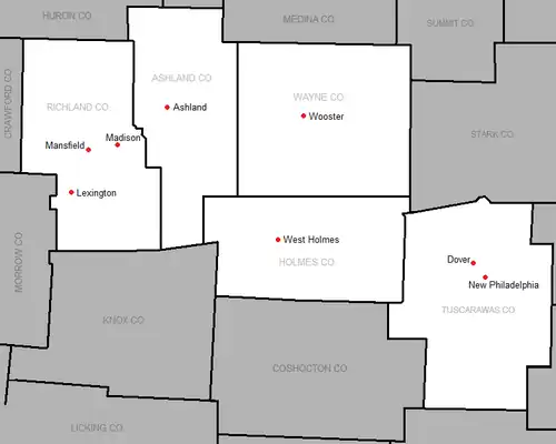 In 2001, local athletic directors met in Mansfield, Ohio to discuss the formation of a new athletic conference; seven schools agreed to form the Ohio Cardinal Conference.[1] Five of the initial member schools came from the disbanding Ohio Heartland Conference: Ashland, Lexington, Mansfield Madison, Mansfield Senior, and Orrville.[2] West Holmes joined from the Mohican-Area Conference, and Wooster from the Federal League.[2] Clear Fork, the only non-original member of the conference, joined for the 2004-05 season.