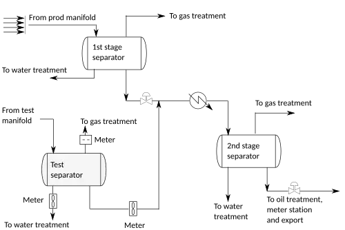 A test separator (see diagram) enables the performance of individual wells to be determined. An individual well is connected to the test header which routes fluids to the test separator. Three phase separation into oil, vapour and produced water takes place. The flowrates of these phases are accurately measured as the fluids flow to lower pressure points in the oil train. The flowrates determine the performance of the well in terms of the maximum flow of the well, the gas-oil ratio, and the water cut of the fluids.