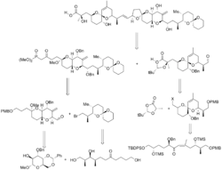 Similar to Isobe's synthesis, the Forsyth synthesis sought to reduce the number of steps, and to increase potential for designing analogues late in the synthesis. To do this, Forsyth et al. designed the synthesis to allow for structural changes and installation of important functional groups before large pieces were joined. Their resulting synthesis was 3% yielding, with 26 steps in the longest linear sequence. As above, spiroketalization was performed thermodynamically with introduction of acid.[5][14]