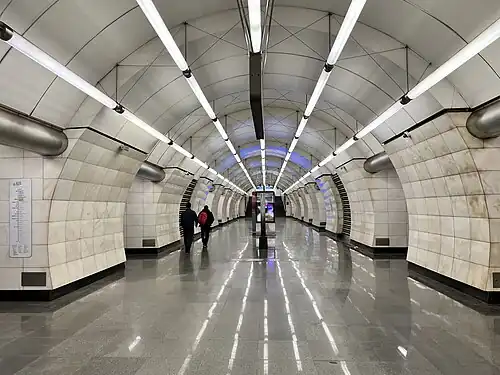Okruzhnaya (Russian: Окружная) is a station on the Lyublinsko-Dmitrovskaya line of the Moscow Metro between Petrovsko-Razumovskaya and Verkhniye Likhobory. The extension of the Lyublinsko–Dmitrovskaya line between Petrovsko-Razumovskaya and Seligerskaya, including Okruzhnaya opened on 22 March 2018.[1] The station is in Timiryazevsky District of Moscow, at the intersection of Lokomotivny Lane and Tretiy Nizhnelikhoborsky Lane.