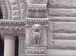 The entire building has ornamentation derived from ancient Roman art. There are structural decorations used by the different colours of stone. The stone carvers did not complete work until a year after opening day, as there were many decorative pieces. The stonework on the entrance was restored in 1999.