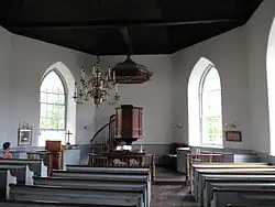 The interior has its wooden pews, with two side aisles, arranged so all can focus on the pulpit. The pulpit is located on a raised platform in the rear, directly opposite the main entrance. A balustrade with turned wooden posts, open at the aisles, sets the platform off from the rest of the wide-planked floor. Behind it is a table, with a lectern on the north and an enclosed pew along the south side. The ornate wooden pulpit is raised further above the table level; access is provided by a short spiral stair. A pipe organ is located at the rear.[3]