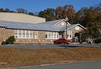The Old Rock School (also known as the Guntersville City School) is a historic building in Guntersville, Alabama. The one-story building was constructed in 1926 in a flat-figure 8 shape, with two courtyards in the middle. It was built in the American Craftsman style, with rock facing and exposed rafters tails. The school was born of Progressive Era philosophy of providing proper facilities for education, including modern plumbing, proper lighting and ventilation, and ample open space. An auditorium allowed for classes in drama and music, as well as public concerts and performances. After the school was replaced in the 1970s, several other groups utilized the building. Its current tenant is The Whole Backstage, a non-profit youth drama organization.[2] A new, 337-seat auditorium was constructed in 2005.[3] The building was listed on the National Register of Historic Places in 2003.[1]