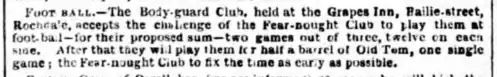 On Christmas Day 1841, an early documented match between two self-described "football clubs" took place. The Body-guard Club (of Rochdale) lost to the Fear-nought Club after using an ineligible player as a substitute.[8][9][10] The complete rules used in this game are unknown, but they specified twelve players on each side,[9] with each team providing its own umpire, and the game being started by the firing of a pistol.[10]