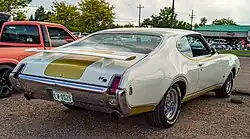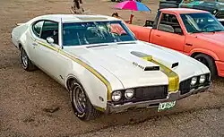 The first Hurst/Olds was the 1968 Hurst/Olds. It shared its body with the regular Oldsmobile Cutlass and 442, but had a unique Peruvian Silver and Black paint scheme. The Hurst/Olds was powered by a 390 hp (395 PS; 291 kW) @ 5000 rpm and a maximum torque of 500 lb⋅ft (678 N⋅m) @ 3200 rpm, 308° duration cam W-45 (without A/C) or 285/287° duration cam W-46 (with A/C), with a displacement of 455 cu in (7.5 L) Rocket V8, equipped with a single 4-barrel Rochester Quadrajet 4GC carburetor.[1][2] This engine was similar to the 400 hp (406 PS; 298 kW) W-34 455 engine offered in the Toronado and the 390 hp (395 PS; 291 kW) W-33 455 option available on the full-sized Delta 88. The W-45 and the milder W-46 engines differed in camshaft and cylinder head selection. The 455 was mated to a code OW three-speed Turbo-Hydramatic 400 transmission with console-mounted Hurst Dual-Gate shifter that permitted automatic or manually ratcheted shifting.[3]