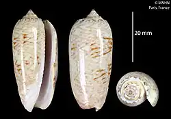 | Shell of Oliva scripta (specimen at MNHN, Paris) | |