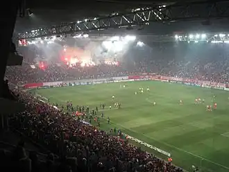 They are the highest ranked Greek club in the UEFA rankings, occupying the 36th place in the ten-year ranking, and the 43rd in the five-year ranking as of 2024. They are also the Greek club with the most wins in all European competitions, leading also the table with the most home and away wins,[6][7] and the Greek team with the most games played in European level, celebrating their 200th match on 23 February 2010, against Bordeaux in the 2009–10 UEFA Champions League first knockout round. Olympiacos also holds the all-time record attendance for a Greek club of 75,263 in a 1982–83 European Cup match against Hamburg at the Athens Olympic Stadium.[8] They are one of the founding members of the European Club Association.