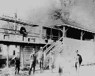 The Ontario Southern had a unique design. It was an early example of a monorail, consisting of a single running rail which was laid on top of a wood beam, with guide rails mounted on each side. The majority of the line was elevated 10 to 30 feet (3 to 9 meters) on wooden posts, giving rise to the nickname "the Peg-Leg Railway". The line also passed through one small tunnel under a road.[1]