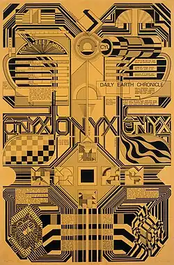 Onyx is a multi-member collective that was active in New York City from 1968 through the early 1970s and active intermittently to the present. Its members - Ron Williams, Woody Rainey, Tommy Simpson, Mike Hinge, Bob Buxbaum, Davis Allen, Sheridan Bell and Jack Wells among others—published architectural projects in the form of offset-printed posters or "broadsheets" that were mailed internationally. The members also went by a number of pseudonyms including Charles Albatross, Okra Plantz, Patrick Redson and Harvey Grapefruit.[1] The poster format allowed the rapid reproduction and easy circulation of their ideas. While the collective distributed their posters through the postal service they also pasted the posters up throughout the streets of the city. There are many connections to the "mail art" phenomenon; the collective claimed affiliation with this artistic practice through the labeling of mailings as MAIL ART and interaction with others practicing this form, including Ant Farm, and Ray Johnson. Characterized by an intricate layering of text and images, the ONYX posters described speculative architectural projects, made allusions to architectural history, explored practices of architectural representation, and commented obscurely on current sociopolitical events.