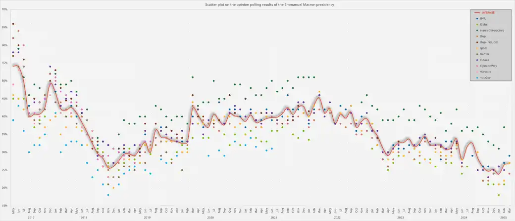 | Elabe | 11–12 Feb 2025 | 1,000 | 21% | 71% | 8% | 50% | 21% | 64% | 15% | 43% | [d] |