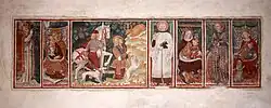 On the left wall is a long cartouche containing seven frescoes. From left to right:[18]