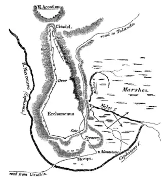 In the Bronze Age, during the fourteenth and thirteenth centuries BC, Orchomenos became a rich and important centre of civilisation in Mycenaean Greece and a rival to Thebes. The palace with its frescoed walls and the great beehive tomb show the power of Orchomenos in Mycenaean Greece. A massive hydraulic undertaking drained the marshes of Lake Kopaïs, making it a rich agricultural area.[2] Orchomenos is mentioned among the Achaean cities sending ships to engage in the Trojan War in Homer's "Catalogue of Ships" in the Iliad: together with Aspledon, they contributed thirty ships and their complement of men. The wealth brought in via the agricultural land under its control probably explains its Homeric epithet "rich in gold" (Toλúxpuσos).[3]