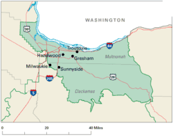 Boring , Damascus , Estacada , Government Camp , Happy Valley (part; also 5th ), Mount Hood Village , Portland (part; also 1st and 5th ; shared with Multnomah and Washington counties) Rhododendron , Sandy