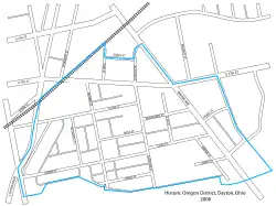 The origin of the name "Oregon" for the area is uncertain but is known to have been in use at least as early as 1845.[4] In 1974, Oregon was registered on the National Register of Historic Places, between Patterson Blvd. and Wayne Ave., north to Gates St. and south to U.S. Route 35, and Downtown Dayton (No. 75001506).[5] City of Dayton Ordinance #24358-9.[6]