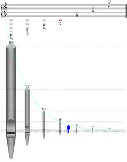 The lowest pipes in a rank are long, and the highest are short. The progression of the length of pipes is dictated by physics alone, and the length must halve for each octave. Since there are twelve semitones in an octave, each pipe differs from its neighbours by a factor of . If the diameters of the pipes are scaled in the same way, so each pipe has exactly the same proportions, it is found that the perceived timbre and volume vary greatly between the low notes and the high, and the result is not musically satisfactory. This effect has been known since antiquity, and part of the organ builder's art is to scale pipes such that the timbre and volume of a rank vary little, or only according to the wishes of the builder. One of the first authors to publish data on the scaling of organ pipes was Dom Bédos de Celles. The basis of his scale was unknown until Mahrenholz discovered that the scale was based on one in which the width halved for each octave, but with addition of a constant.[3] This constant compensates for the inappropriate narrowing of the highest pipes, and if chosen with care, can match modern scalings to within the difference of diameter that one would expect from pipes sounding notes about two semi-tones apart.