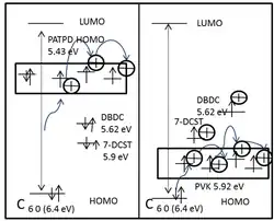 Besides the mobility, the ionization potential of the polymer and the respective dopant has also significant importance. The relative position of the polymer HOMO with respect to the ionization potential of the other components of the blends determines the extent of extrinsic hole traps in the material.[17] TPD (tetraphenyldiaminophenyl) based materials are known to exhibit higher charge carrier mobilities and lower ionization potentials compare to carbazole based (PVK) materials. The low ionization potentials of the TPD based materials greatly enhance the photoconductivity of the materials. This is partly due to the enhanced complexation of the hole conductor, which is an electron donor, with the sensitizing agents, which is an electron acceptor. It was reported a dramatic increase of the photogeneration efficiency from 0.3% to 100% by lowering the ionization potential from 5.90 eV (PVK) to 5.39 eV ( TPD derivative PATPD).[18] This is schematically explained in the diagram using the electronic states of PVK and PATPD.