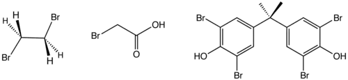 Structure of three industrially significant organobromine compounds. From left: ethylene bromide, bromoacetic acid, and tetrabromobisphenol-A.