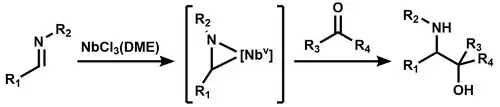 A prominent early synthetic application of organoniobium chemistry was the use of dimethoxyethane niobium trichloride, NbCl3(DME), as a reagent for the reductive coupling of imines with carbonyl compounds to form amino alcohols.[9] This reagent has found further use in other pinacol-type reductive couplings.[10][8]
