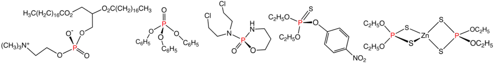 Illustrative organophosphates and related compounds: phosphatidylcholine, triphenylphosphate, cyclophosphamide, parathion, and zinc dithiophosphate.