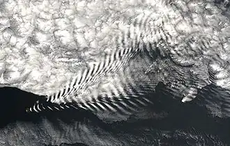 A gravity wave cloud pattern—analogous to a ship wake—in the downwind zone behind the Île Amsterdam, seen from above over the far southern Indian Ocean. The island generates wave motion in the wind passing over it, creating regularly spaced orographic clouds. The wave crests raise and cool the air to form clouds, while the troughs remain too low for cloud formation. Note that while the wave motion is generated by orographic lift, it is not required. In other words, one cloud often forms at the peak. See wave cloud.