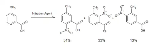 The ortho effect also occurs when a meta-directing group is positioned in a meta arrangement relative to an ortho–para-directing group, a new substituent introduced into the molecule tends to preferentially occupy the ortho position relative to the meta-directing group rather than the para position. Currently, there is no definitive explanation for the ortho effect, but it is hypothesized that there may be intramolecular assistance from the meta-directing group influencing the positioning of the incoming substituent.[3] For example, the electrophilic aromatic nitration of 1-methyl-3-nitrobenzene affords 4-methyl-1,2-dinitrobenzene and 1-methyl-2,3-dinitrobenzene in 60.1% and 28.4% yields, respectively.[4] In contrast, 2-methyl-1,4-dinitrobenzene (2c) is isolated in only 9.9% yield.[4] As witnessed in the above example, when a π-acceptor substituent (πAS) is meta to a π-donor substituent (πDS), the electrophilic aromatic nitration occurs ortho to the πAS rather than para.