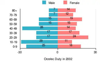 According to the 2002 Poland census, there were 304 people residing in Orzelec Duży village, of whom 52.6% were male and 47.4% were female. In the village, the population was spread out, with 24.3% under the age of 18, 36.2% from 18 to 44, 16.4% from 45 to 64, and 23% who were 65 years of age or older.[1]