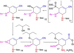 14. ^ a b c d Ishikawa, Hayato; Suzuki, Takaki; Hayashi, Yujiro (2009-02-02). "High-Yielding Synthesis of the Anti-Influenza Neuramidase Inhibitor (−)-Oseltamivir by Three "One-Pot" Operations". Angewandte Chemie International Edition. 48 (7): 1304–1307. doi:10.1002/anie.200804883. ISSN 1521-3773. PMID 19123206.