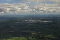 The airport is located 19 nautical miles (35 km; 22 mi) northeast of Oslo, at Gardermoen at the border of municipalities Nannestad and Ullensaker, in Akershus county.[4] It has two parallel roughly north–south runways measuring 3,600 metres (11,811 ft) and 2,950 metres (9,678 ft) and 71 aircraft stands, of which 50 have jet bridges. The airport is connected to the city center by the high-speed railway Gardermoen Line served by mainline trains and Flytoget. The percentage of passengers using public transport to get to and from the airport is one of the highest in the world at nearly 70%.[5] The ground facilities are owned by Oslo Lufthavn AS, a subsidiary of the state-owned Avinor. Also at the premises is Gardermoen Air Station, operated by the Royal Norwegian Air Force. An expansion with a new terminal building and a third pier opened in late April 2017.[6][7]