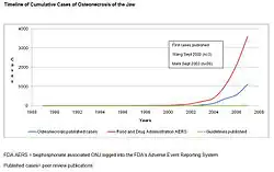 The first three reported cases of bisphosphonate-associated osteonecrosis of the jaw were spontaneously reported to the FDA by an oral surgeon in 2002, with the toxicity being described as a potentially late toxicity of chemotherapy.[12] In 2003 and 2004, three oral surgeons independently reported to the FDA information on 104 cancer patients with bisphosphonate-associated osteonecrosis of the jaw seen in their referral practices in California, Florida, and New York.[13][14][15] These case series were published as peer-reviewed articles – two in the Journal of Oral and Maxillofacial Surgery and one in the Journal of Clinical Oncology. Subsequently, numerous instances of persons with this adverse drug reaction were reported to the manufacturers and to the FDA. By December 2006, 3607 cases of people with this ADR had been reported to the FDA and 2227 cases had been reported to the manufacturer of intravenous bisphosphonates.