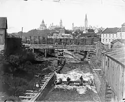 Also in 1869, about a third of the lumber manufactured at Ottawa was shipped to foreign countries, and the area employed 6,000 men in cutting and rafting logs, about 5,500 in the preparation of squared timber for European markets, and about 5,000 at the mills in Ottawa.[13] Somewhere between 1848 and 1861, a large increase in the number of sawmills in "the town" had occurred, as did dwellings, from 601 dwellings and 3 sawmills in 1845, to 2,104 dwellings and 12 sawmills by 1861.[14]