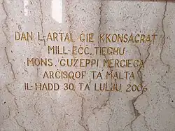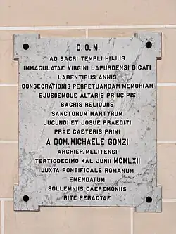 (N.B. The church of Our Lady of Lourdes, San Ġwann, was consecrated on May 12, 1962, and not on May 20, as stated in the inscription above.)