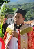 Nowadays, the celebration of the Palm Sunday, as well as the other celebrations, follow the rite promulgated by the Second Vatican Council, and begins at the windows of the Church of Our Lord of Bonfim. Upon arrival, the priest greets the people in the usual way, recites the prayers, and sprinkles the branches with holy water. The proclamation of the Gospel is made and then the procession is announced. At the beginning of the procession, immediately in front, goes the acolyte with the lighted thurible, and then, according to ancient local custom, the cruciferary, a Brother of the Blessed Sacrament with the ornamented cross; two Brothers leading the lanterns forming the wing of the faithful on the sides of the street in single line. In the center, the youth group of the Stations of the Cross Pastoral, followed by the guild of the Brotherhood of the Blessed Sacrament with the parish priest, accompanied by the Phoenix Band that performs the traditional dobrados and festive marches from its repertoire. When the priest arrives at the Mother Church, where the altar for the outdoor mass is located, he continues the celebration in the usual way, without the presence of the traditional choir and orchestra. On Palm Sunday evening and Holy Monday, the other celebrations of the Feast of the Steps take place.[42]