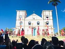 The Our Lady of the Rosary Parish is a place that stands out for its popular Catholicism manifestations, an intangible heritage that is a great expression of the sociability of Pirenópolis. These manifestations are based on the traditional Catholic faith, on syncretism, on the diversity of symbols, and on the feasts that organize a specific culture, attracting not only the city's descendants who live in other places, but also tourists and visitors to see the performance of groups that have maintained the local culture for centuries. These customs are influenced by the European culture of the Portuguese who populated the city, especially the confraternities that dictated the local customs and knowledge from the 18th to the 20th centuries. Besides this, the presence of Afro-Brazilian cultural and religious manifestations is noticeable, whether in the ringing of the bells that are reminiscent of the congada and the Banda de Couro that accompany the celebrations, or in the influences of the people from the countryside, which are seen in the folias, the kermesses, the auctions, and in the simplicity of people's devotion.[1]