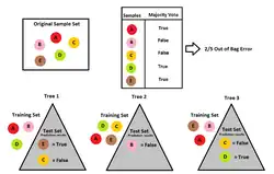 Out-of-bag (OOB) error, also called out-of-bag estimate, is a method of measuring the prediction error of random forests, boosted decision trees, and other machine learning models utilizing bootstrap aggregating (bagging). Bagging uses subsampling with replacement to create training samples for the model to learn from. OOB error is the mean prediction error on each training sample xi, using only the trees that did not have xi in their bootstrap sample.[1]