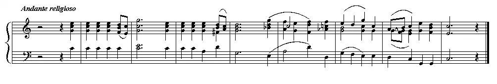 The piece's dark, slow texture has its main theme in the major key, as seen here in its first appearance in Myles B. Foster's piano reduction: