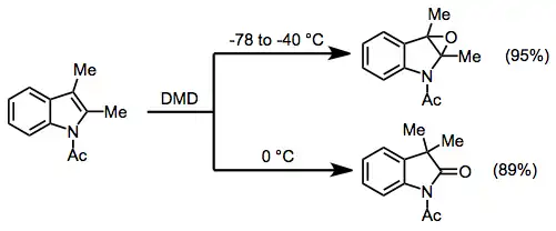 The oxidations of heteroaromatic compounds can depend on conditions. Thus, at low temperatures, acetylated indoles are simply epoxidized in high yield (unprotected indoles undergo N-oxidation). However, when the temperature is raised to 0 °C, rearranged products are obtained.[2]