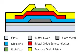 Cross sectional diagram of typical metal oxide thin film transistor. In this case the "oxide" refers to the semiconducting layer between the source and drain electrodes.
