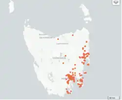 Ozothamnus scutellifolius is a hardy shrub endemic to dry eucalypt woodland in well-drained soils in the east of Tasmania.[10] Distribution ranges from St. Helens at the northern tip, south along the east coast and southern midlands to Cape Bruny on Bruny Island, with very small outlying populations scattered along the Central plateau and the northern coast.[11] Despite local abundance, it is considered an endangered species[12] due to its restricted global distribution.
