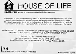 Upon the urging of his friends, Father Marie-Benoît disappeared from France and resurfaced in Rome as Padre Benedetti.[7] One of his hiding places was commemorated by the International Raoul Wallenberg Foundation, a non-governmental organization which researches Holocaust rescuers and advocates for their recognition.