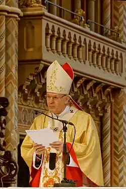 Péter Erdő (Hungarian: Erdő Péter, pronounced [ˈɛrdøː ˈpeːtɛr]; born 25 June 1952) is a Hungarian cardinal of the Catholic Church who has served as the Archbishop of Esztergom-Budapest and Primate of Hungary since 2003.[1] He was president of the Council of the Bishops' Conferences of Europe from 2006 to 2016. He was the relator general for the Third Extraordinary General Assembly of the Synod of Bishops in Rome.