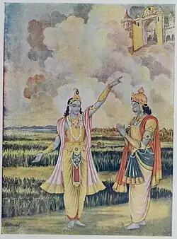 Krishna (left) wearing yellow garments, with Arjuna (right).