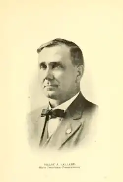 P. A. Ballard was born in 1863 in Kentucky. He attended the Taylor Institute in Platt City, Missouri, Ellis Academy in Pittsburg, Missouri, and Christian Brothers College High School in St. Louis. He was an oil inspector during the tenure of Governor Alexander M. Dockery in Missouri. He moved to Oklahoma in 1903 and was elected to the inaugural Oklahoma House of Representatives in 1907.[1] He defeated incumbent Milas Lasater in the 1910 Democratic primary and later won the general election.[2] He resigned on April 29, 1913, after being impeached by the Oklahoma House of Representatives, but before his trial in the Oklahoma Senate.[3] He was replaced by A. L. Welch.[4]