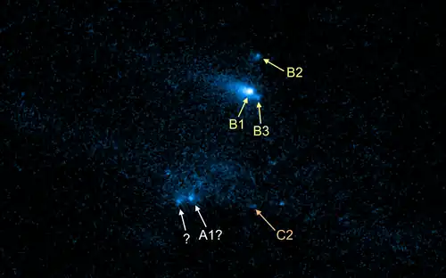 Observations by Hubble on 29 October 2013 showed that component B was initially a single object possessing its own dusty coma and tail. On 15 November 2013, component B began to split into two fragments, B1 and B2, that eventually moved far enough apart to be resolved by Hubble on 13 December 2013.[5]: 12 The fainter fragment, B2, separated from B1 at a relative speed of 0.32 m/s and faded steadily with constant absolute magnitude.[5]: 3, 9, 12 On the other hand, the brighter fragment B1 had its absolute magnitude brighten by more than a magnitude between 13 December 2013 and 14 January 2014, before ejecting another small fragment, B3, that was seen by Hubble on 13 February 2014. This sudden brightening of B1 may be associated with the beginning of B3's separation, based on similar behavior seen in comets before fragmenting.[5]: 12